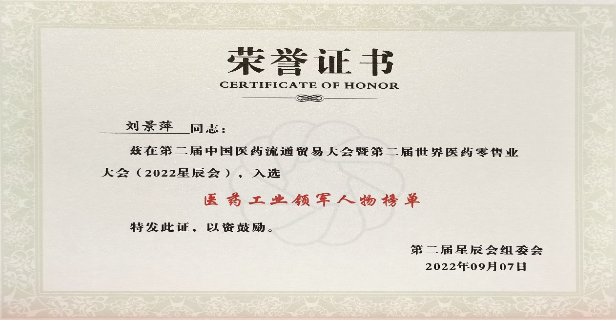 本次星辰会期间,东升国际斩获颇丰,获得多项行业奖项及荣誉。在开幕式上,刘景萍董事长荣获“医药工业领军人物”称号。